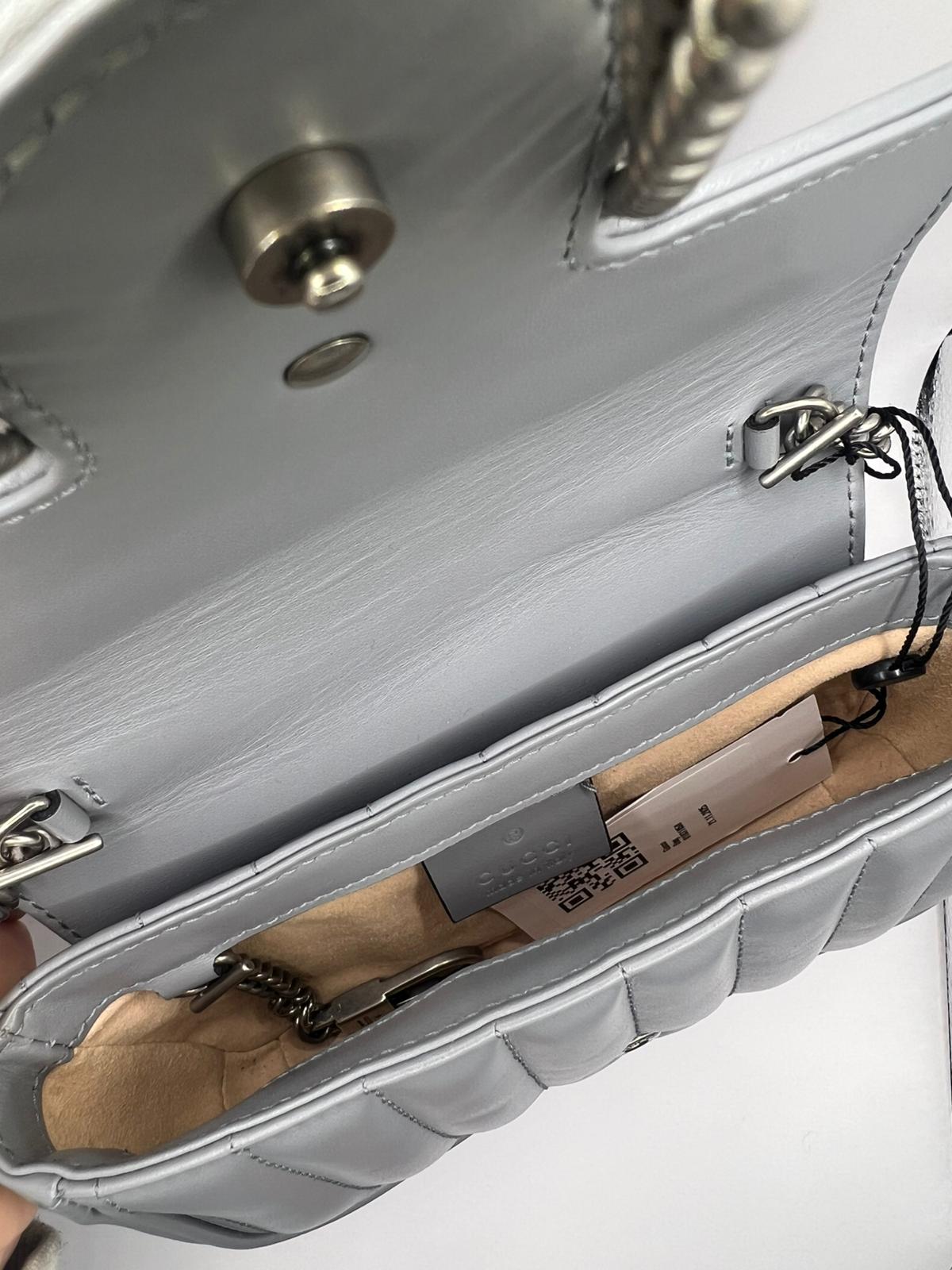 Mini GG Marmont bag with chain, featuring a key holder. The metal hardware is inspired by an archival design from the 1970s. It is crafted in chevron-quilted leather.